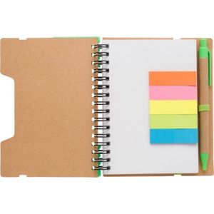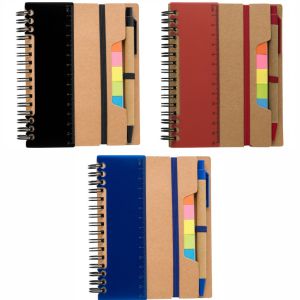 Marque-pages élastique, stylo bille, règle, 125 notes autocollantes et reliure à spirale.