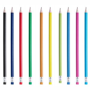 Crayon à papier en bois avec gomme colorée.