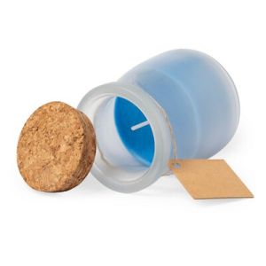 Bougie parfumée dans pôt en verre et couvercle en liège.