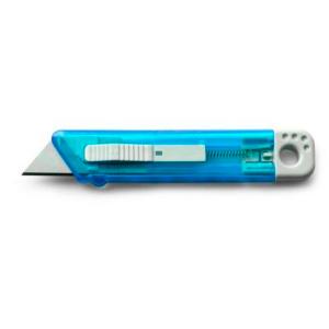 Plastique translucide avec lame rétractable.
