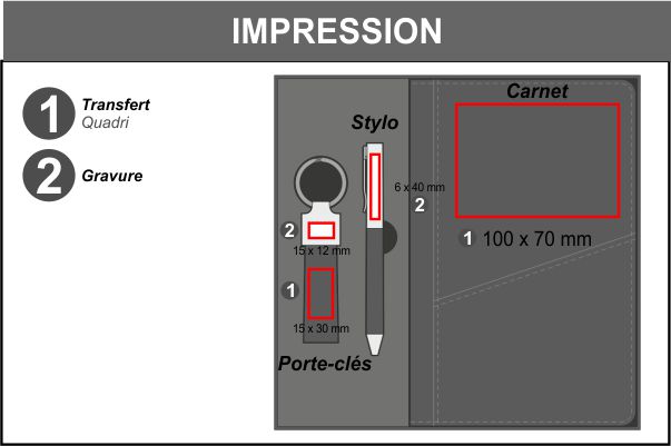 Comprend un porte-clés, un carnet de notes d'environ format A5 avec 100 feuilles lignées avec couverture rigide, et un stylo à bille (encre bleue).